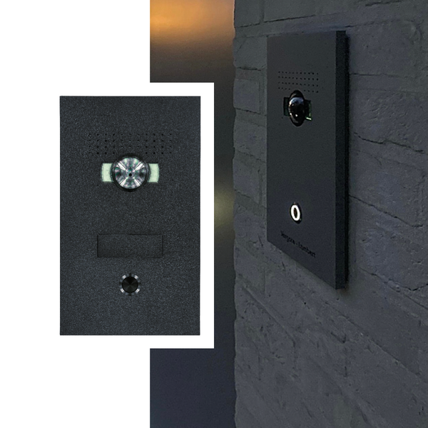 Die Türstation enthält eine Weitwinkelkamera und 1 Ruftaste. Das Namensschild ist abnehmbar und kann individuell graviert werden.